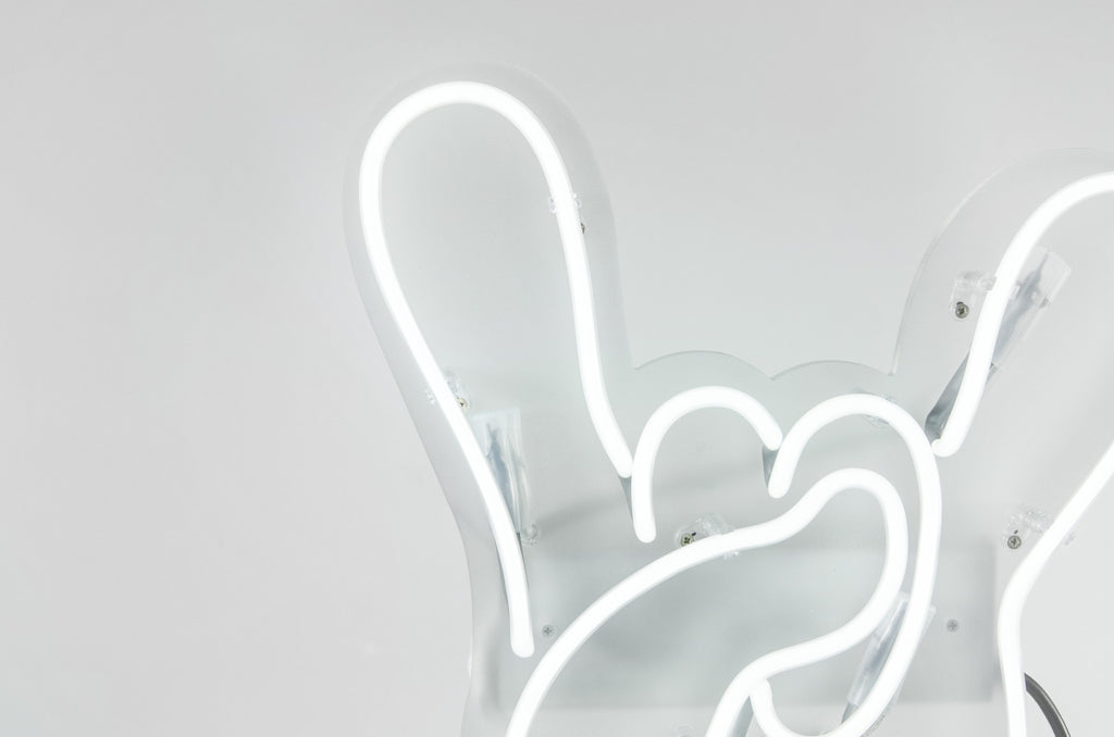 Every installation is handmade in warm-white neon, and pre-assembled on a transparent acrylic, which is cut in outline around the object. A power cable leads to the plug.
